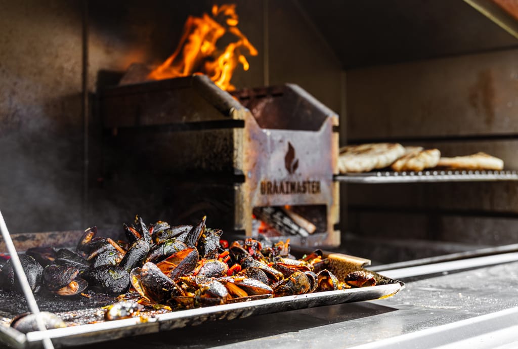 - Door de hitte en de shock van de vinaigrette gaan de mosselen volledig open en nemen ze de smaken op. (Tip: trek de vlam uit de firebox over de mosselen voor extra smaak.)