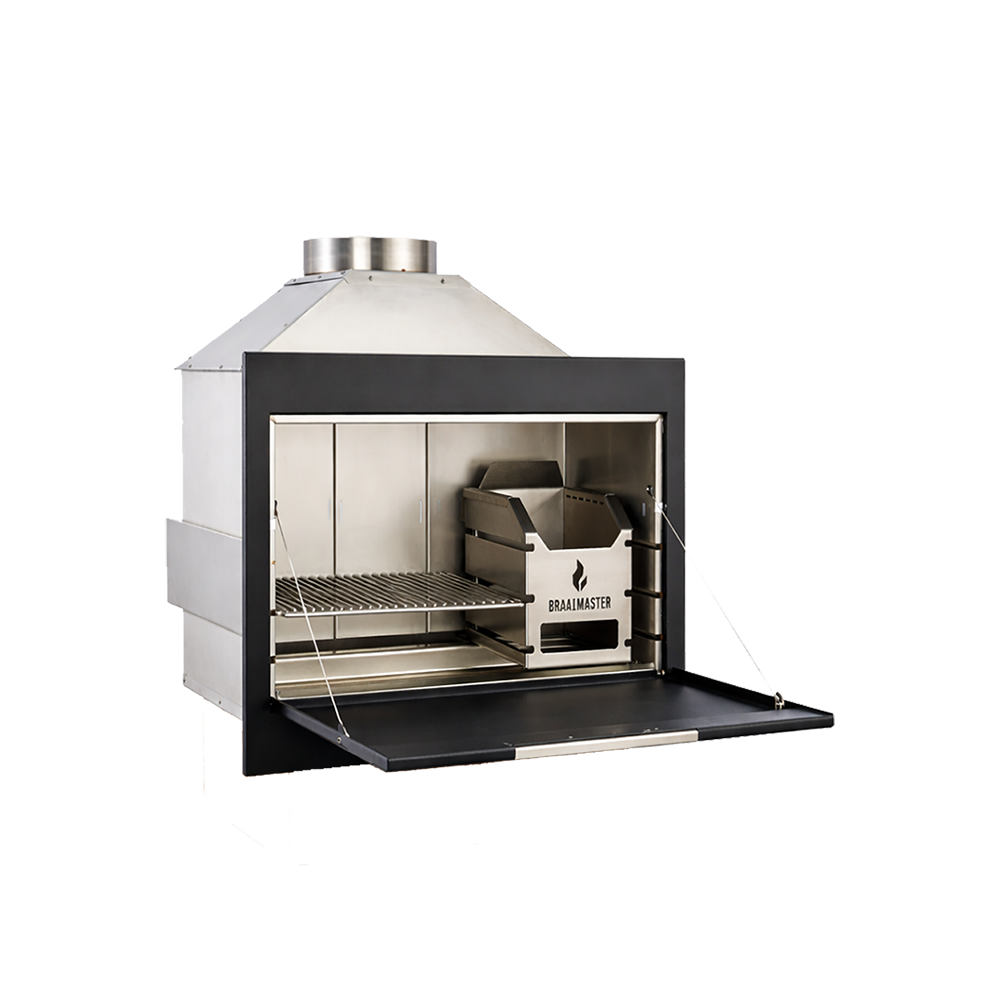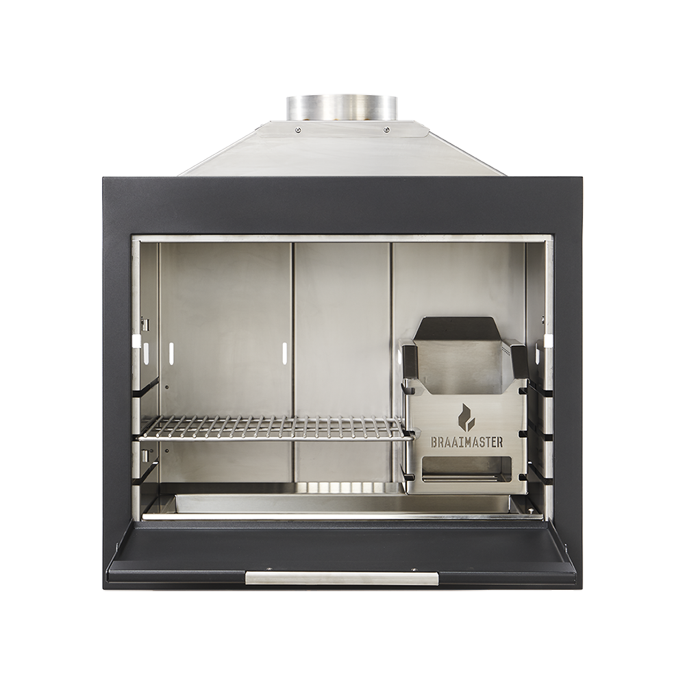 Den autentiska vedeldade inbyggnadsbraaien Braaimaster i svart är speciellt utformad för installation i en öppen spis. Detta gör den här modellen till den som ligger närmast den traditionella braaien som är känd i Sydafrika. Oavsett om du väljer en klassisk stenkonstruktion, isoleringspaneler med stenfaner eller en elegant putsfinish, blir den inbyggda Braaimaster i svart ett riktigt blickfång i ditt trädgårdshus, veranda eller utekök. En permanent plats för eld som inbjuder dig att samlas året runt.