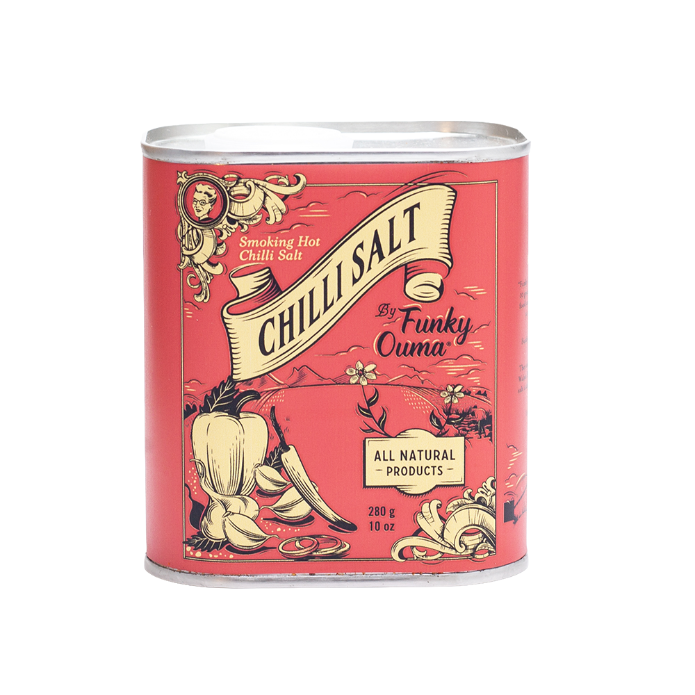 Funky Ouma Chili Salt Tin är en av våra absoluta favoriter. Det här är en mångsidig kryddblandning som kan användas före, under och efter matlagningen. Fantastisk på avokado för en enkel och snabb guacamole. Mycket god till kyckling, biff, pizza, tofu och grönsaker. Vår personliga favorit är på ägg till frukost. Och naturligtvis perfekt i en Bloody Mary! 5 av 10 för styrkan men 10 av 10 för smaken!